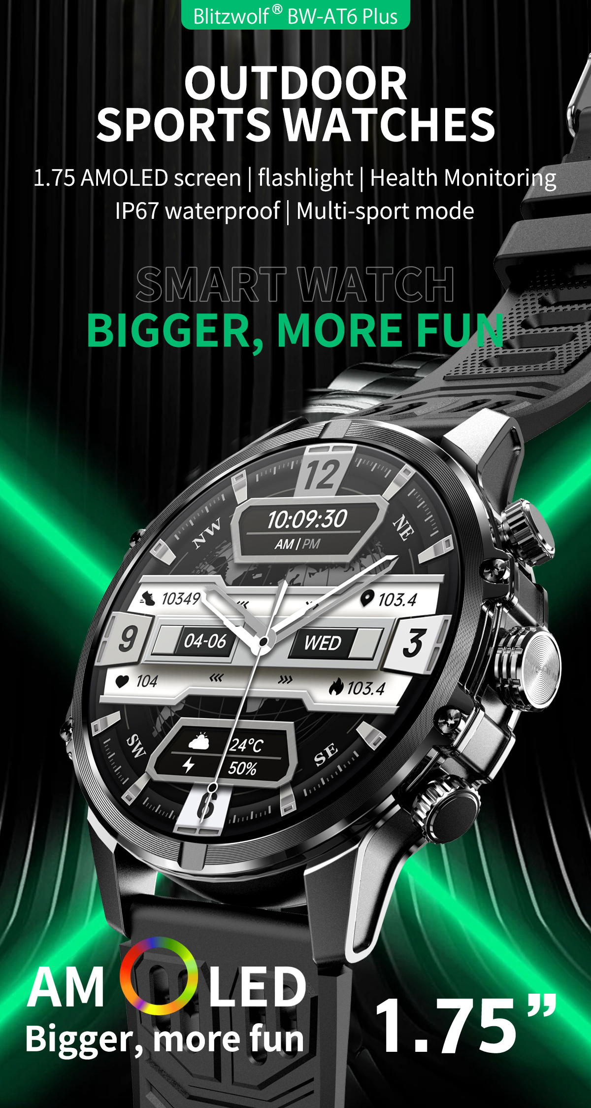 BlitzWolf® BW-AT6 Plus Smart Watch – 1.75" AMOLED Display, Bluetooth Calls, Voice Assistant, Health Monitoring, IP67 Waterproof – Black - Buyme24seven