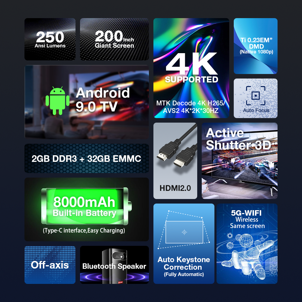 | Display chip | Ti 0.23 inch DMD (with off-axis 100% optical machine) |