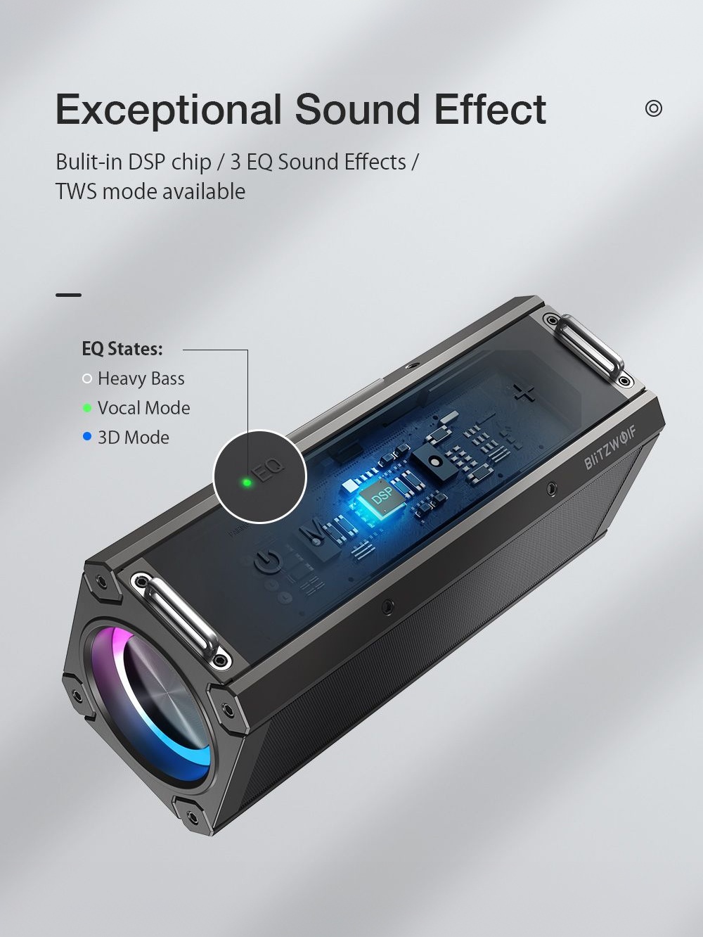 1. 120W Powerful Output-- Enhanced with a strong 120W driver and DSP technology, the BW-WA3 Pro speaker delivers stereo sound with rich bass, tight mids and crystal clear highs.  360° all around sound effect, sense extraoridinary HiFi punchy sound.