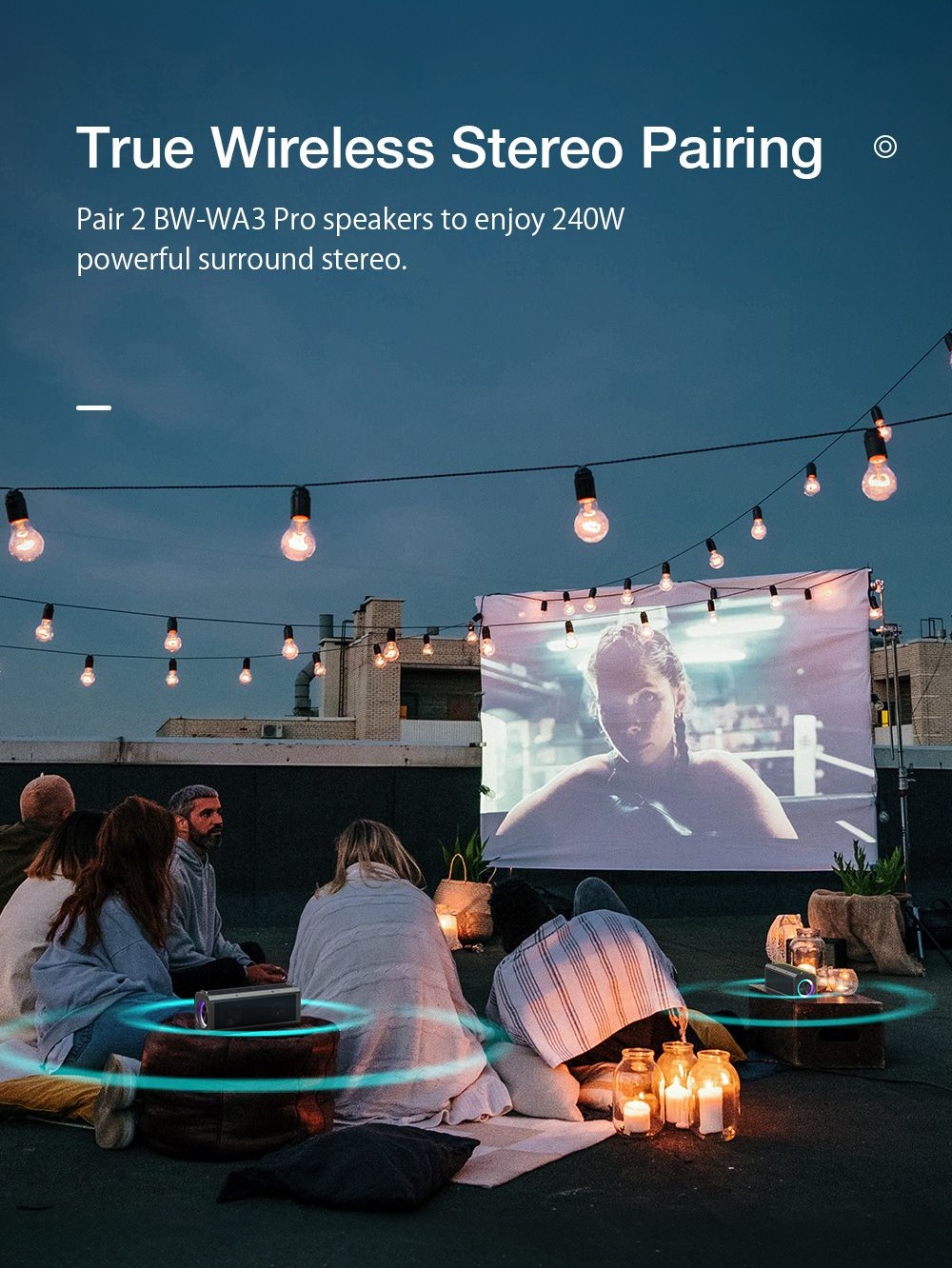4. TWS Pairing, Stereo Sound-- Pair 2 BW-WA3 Pro speakers to enjoy 240W powerful surround stereo.