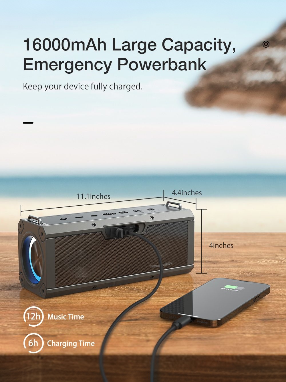 3. 16000mAh Long Endurance-- Long battery life and support USB emergency charging, long enough for any outdoor activities. Wireless portable bluetooth speakers should be a must have in your life.